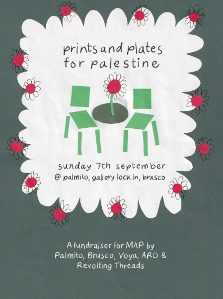 - Prints and Plates for Palestine – Sunday 7 Sept at Palmito, Gallery Lock in and Brusco