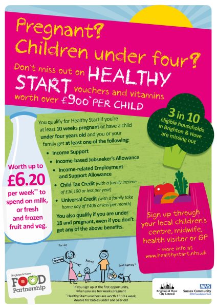 Anyone can download a colourful A4 poster. Organisations working with children and families can also request a free short training session for their staff or volunteers or a bunch of posters by emailing emily@bhfood.bozboz.dev. They can also order Healthy Start application packs from the NHS by calling 0300 123 1002.