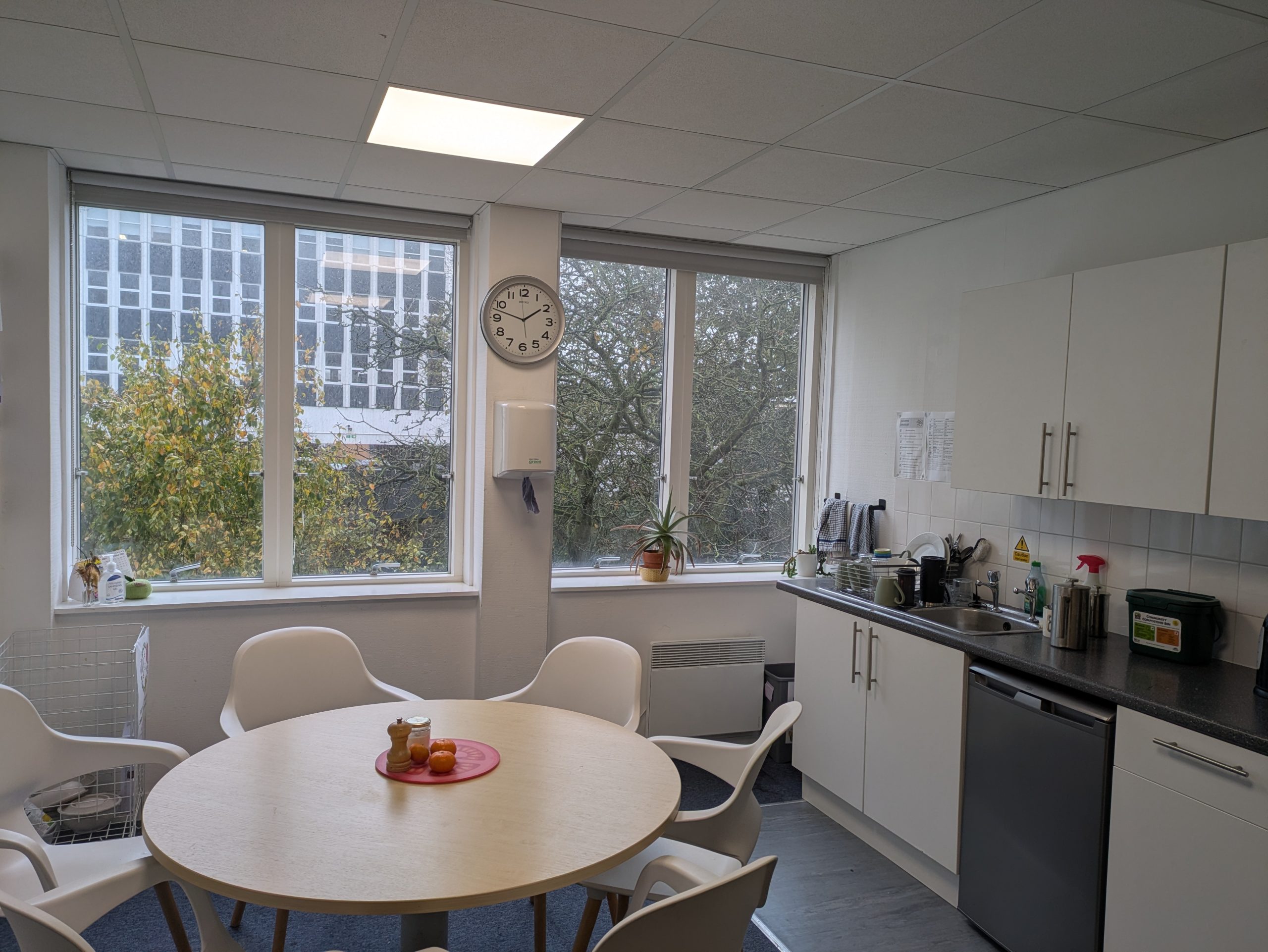 - two bookable meeting rooms, one with a large screen for video meetings