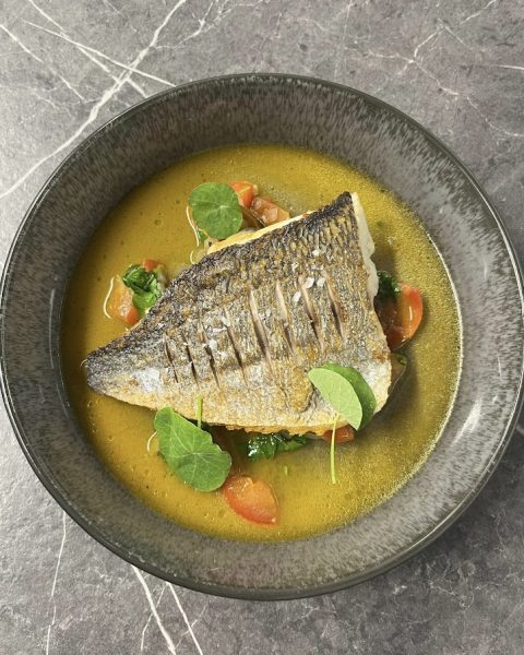 - Pan fried sea bass/bream with a mussel vierge sauce and pea shoot garnish