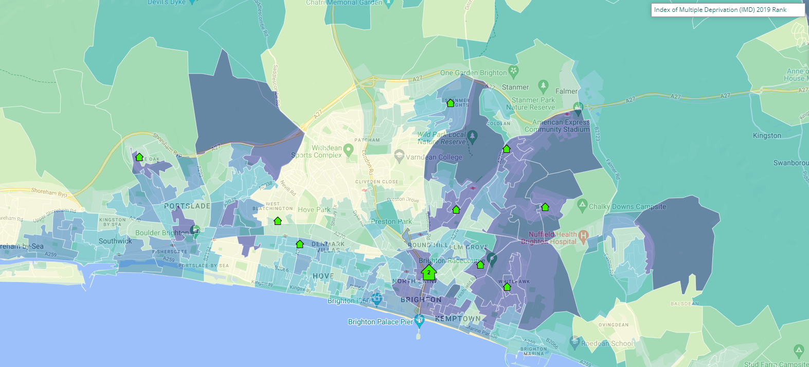 We use something called the Index of Multiple Deprivation (IMD) to map areas. The measure looks at 37 different things that could make an area less privileged, e.g. access to schools/GPs, average household income and calculates them together to come up with final rating. While we know that people are not numbers, and this measure is not perfect, it’s still a useful tool to help us listen to the right people.