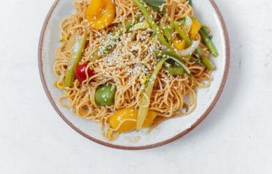 This simple recipe pairs crunchy veggies with chewy rice noodles and marries them in a fragrant soy sauce.