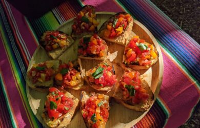 A traditional Italian dish a bit like a mini pizza made with fresh crusty bread, tomatoes, garlic and basil.
