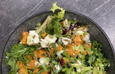 Swap heavy mayonnaise and spuds for roasted sweet potato, salty Greek cheese, fresh herbs and pine nuts.