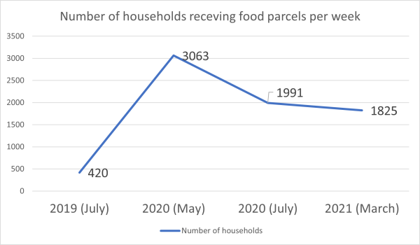 With 1825 households receiving food parcels each week this is a slight reduction from the July 2020 figures but that is still more than 4 times the number being supported before the pandemic in 2019.